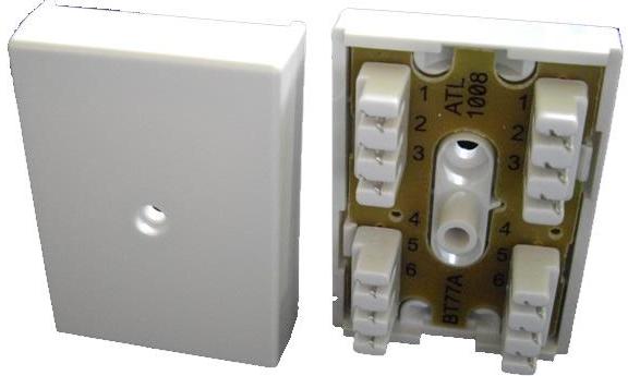 BT 77A junction box, 6 way IDC to 6 way IDC connectors. For joining CW1308 cable or similar. Dimensions (L) 56mm x (W) 41mm x (H) 22mm.